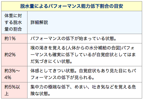 ちなみに、体重70kgであればその1%は700mlです。それだけの水分を失うとパフォーマンスの低下が始まります。おそらく、暖かい時期の1時間程度の運動での発汗量と同程度です。